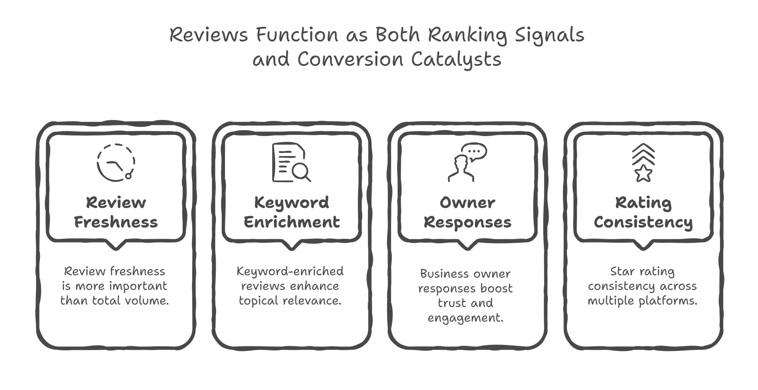 Customer reviews have evolved beyond social proof into fundamental local SEO ranking factors. What distinguishes 2025 is how Google assesses review data.